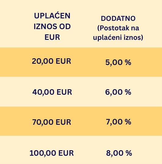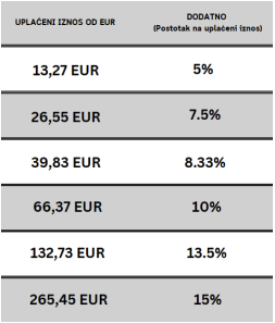 - Uplatom korisnik ostvaruje pravo na bonus novčani iznos prema tablici: